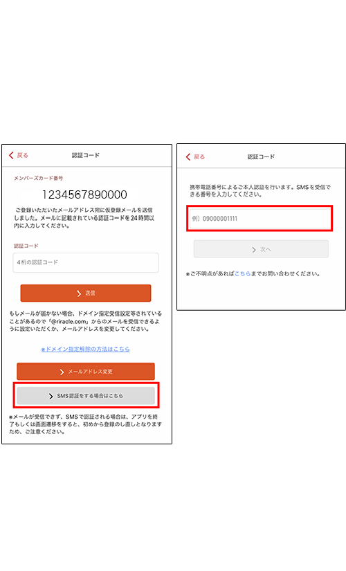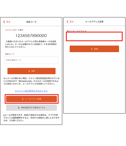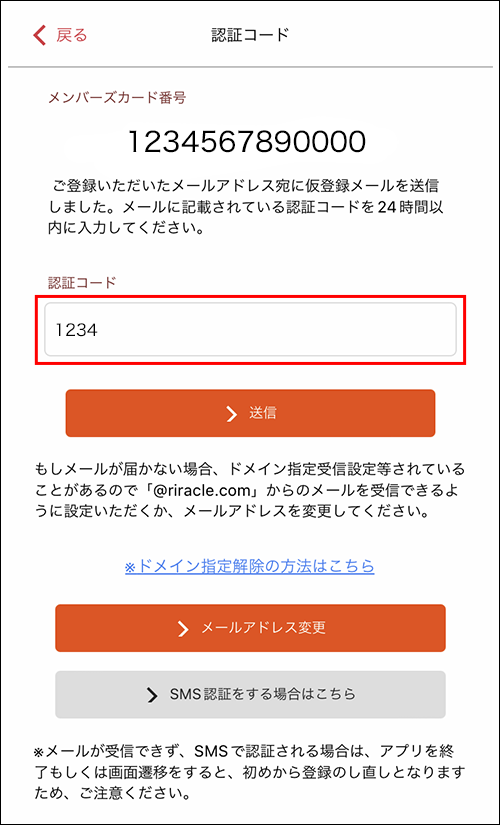 ご登録いただいたメールアドレス宛に、「メンバーズカードNo.」と「認証コード」が届きます。認証コードをご入力いただき、送信をタップ。